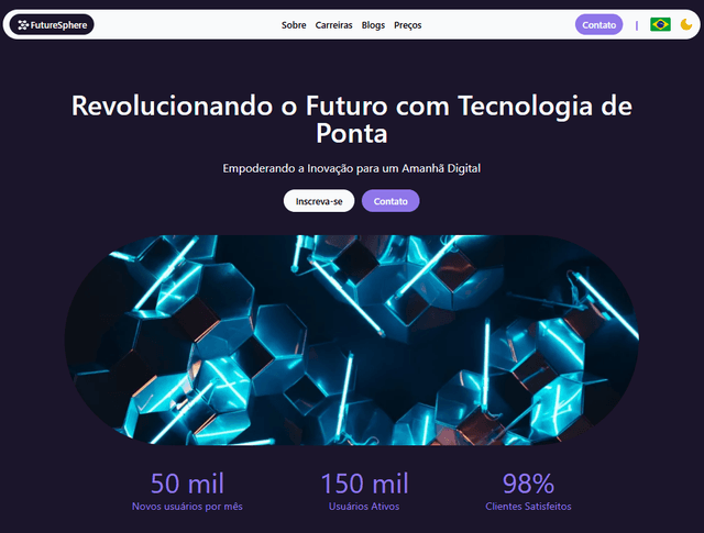 FutureSphere é uma aplicação front-end de demonstração que apresenta soluções tecnológicas inovadoras para empresas e indivíduos. O site possui design moderno, informações sobre serviços, equipe, blog e contato. Seu objetivo é ilustrar funcionalidades e layout para projetos digitais.