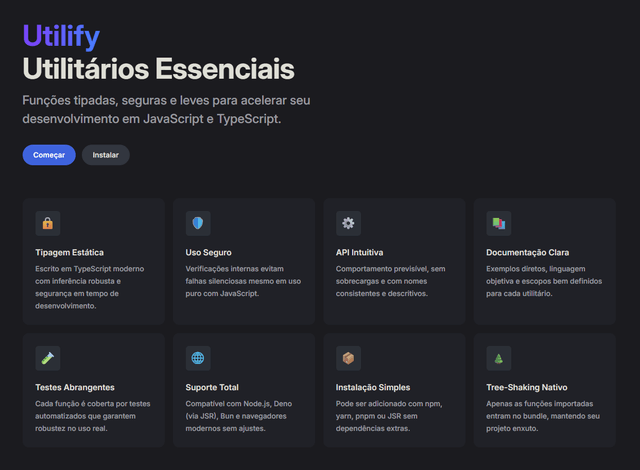 Conjunto de utilitários tipados, seguros e leves para acelerar o desenvolvimento em JavaScript e TypeScript. Possui API intuitiva, documentação objetiva, testes completos e suporte nativo a Node.js, Deno, Bun e navegadores modernos.